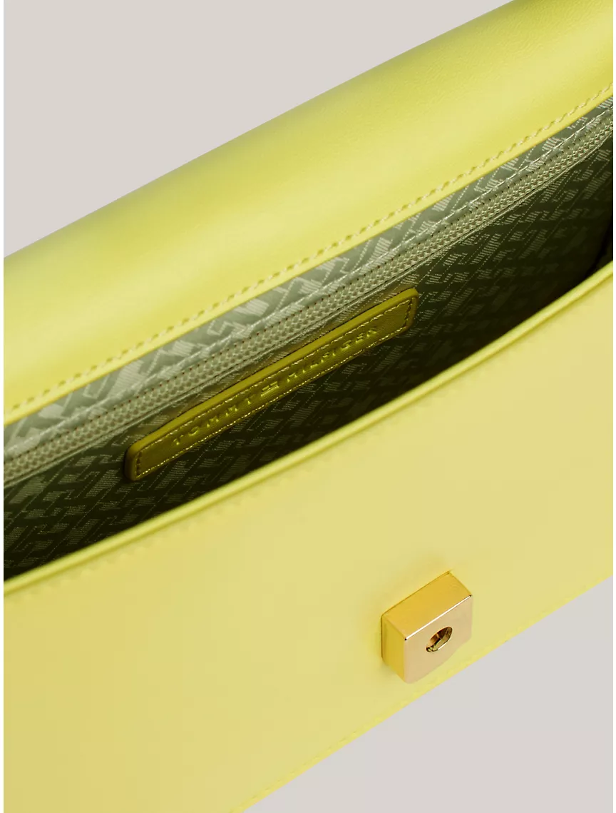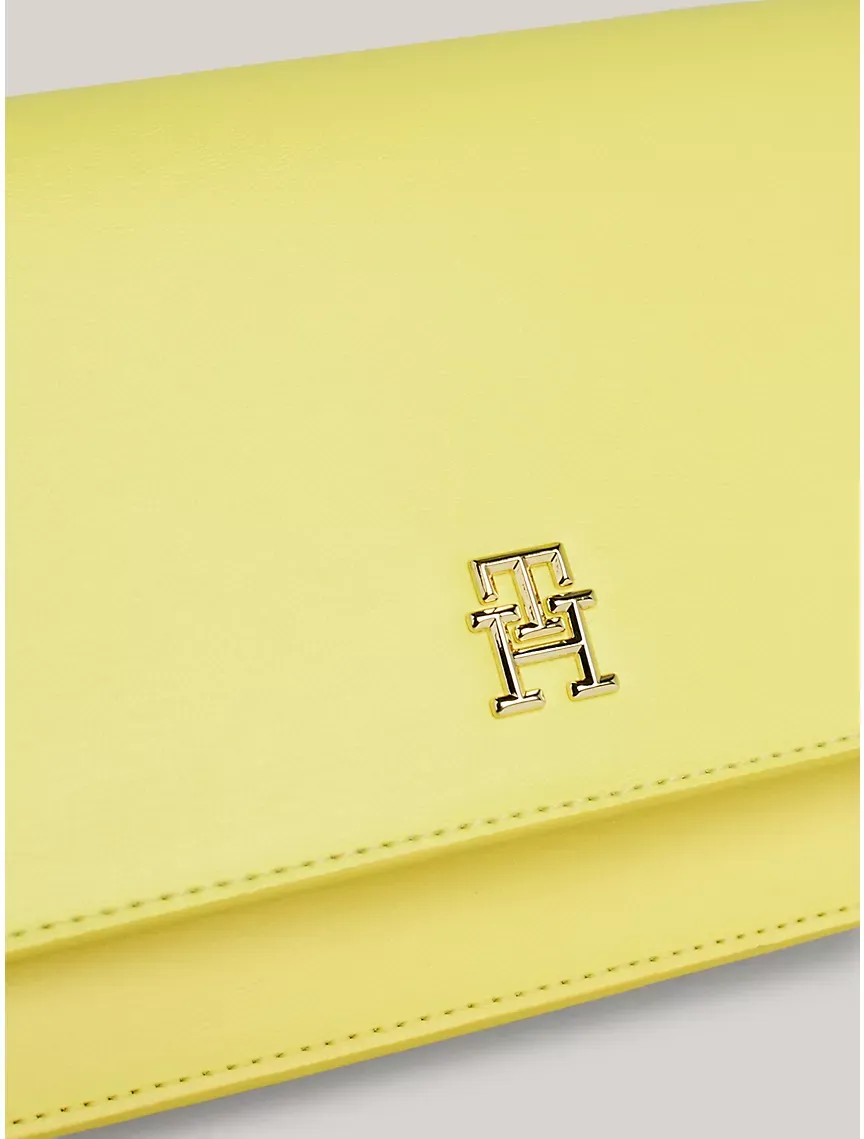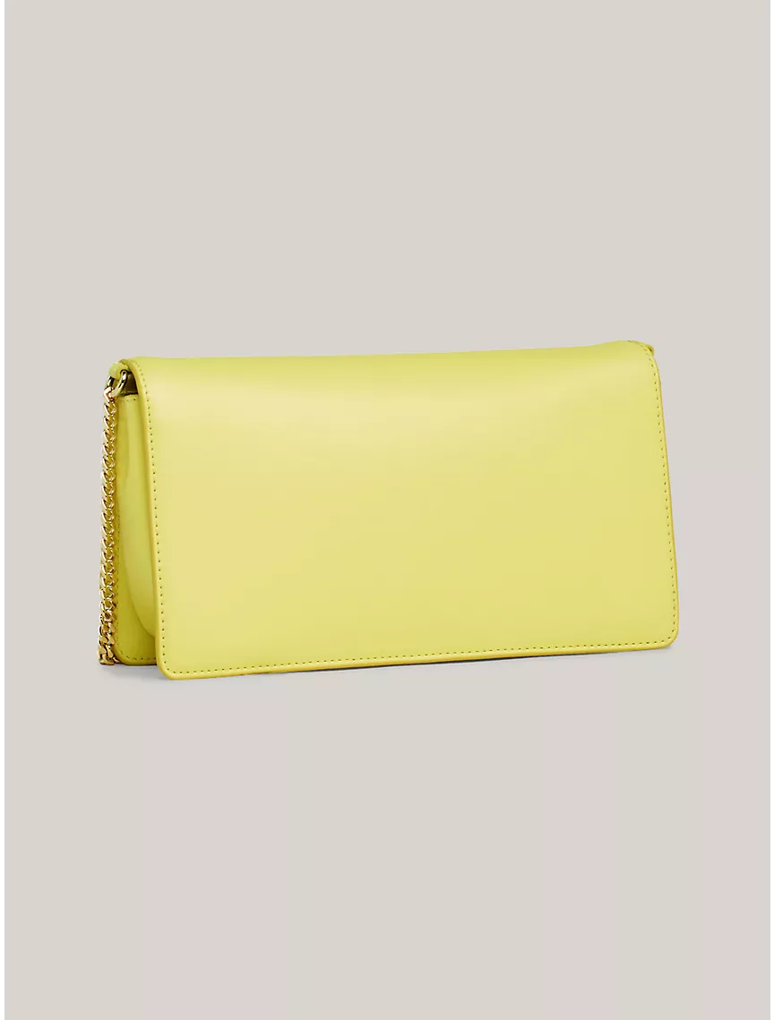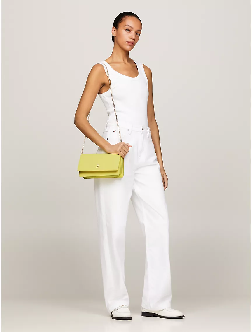 - Flap with snap-button closure, adjustable chain crossbody strap.